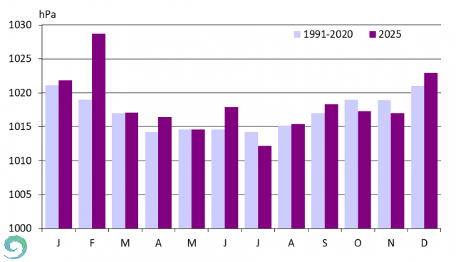 A havi átlagos légnyomás értékek alapján a nagytérségű nyomási képződmények gyakoriságára következtethetünk. 2025-ben Budapest Pestszentlőrincen három olyan hónap volt, amikor a tengerszinti légnyomás havi átlaga elmaradt az 1991-2020-as átlagtól, de sem júliusban, sem októberben és novemberben nem volt jelentős az eltérés. A negatív eltérés általában az alacsony nyomású légköri képződmények nagyobb gyakoriságára utal (26. ábra), ami sok esetben csapadékhullással jár, de itt a három hónap közül csupán a november volt kissé csapadékosabb a megszokottnál. Februárban és júliusban a megszokottnál sokkal magasabb légnyomásértékek adódtak, de áprilisban, szeptemberben és decemberben is meghaladta a havi átlag a normált. Ezeket az anomáliákat többnyire anticiklonális időjárási mintázatok idézik elő. Télen gyakran hidegpárna alakul ki, míg tavasztól őszig tartósan derült, napos idő jellemző, amely hosszan fennmaradva szárazsághoz vezethet. Így volt ez 2025-ben is, mind az öt említett hónap szárazabb volt a megszokottnál.