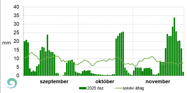 A 2025-ös ősz napi középhőmérsékleteit és a sokéves átlag értékeit a 9. ábrán mutatjuk be. Az évszak 91 napjából 52 napon a normálnál magasabbak voltak a napi átlaghőmérsékletek. Szinte az egész szeptember melegebbnek adódott a megszokottnál, 5-e lett az évszak legmelegebb napja, amikor 23,7 °C volt a napi középhőmérséklet. Ezen a napon mértük ősszel a legmagasabb hőmérsékletet (35,1 °C) is Körösladányban és Körösszakálon, ami egyben új országos napi melegrekord. A normáltól való legnagyobb pozitív eltérés 22-én adódott, több, mint 7 fokkal volt melegebb az átlagnál. 25-én kezdődött egy erőteljes lehűlés, mely hideg periódus október 8-ig tartott. Október 3-án éltük át a legnagyobb negatív anomáliát: országos átlagban 6,2 °C-kal maradt el a hőmérséklet az 1991-2020-as értéktől. Ezt követően a sokéves átlagnak megfelelően alakult időjárásunk, majd két hidegebb nap (19-20) után melegedés volt megfigyelhető. A hónap végén és november elején már 4-6 fokkal mértünk magasabb hőmérsékletet, mint ilyenkor az szokásos. November közepén a Kárpát-medencét több napig egy hidegpárna töltötte ki, majd melegedés kezdődött, mely 17-én tetőzött. Viszont az ekkor érkező markáns hidegfront mögött már sarkvidéki eredetű hideg levegő áramlott hazánk fölé. Az ősz leghidegebb napján, 23-án fagypont alá süllyedt a napi középhőmérséklet (-0,2 °C).