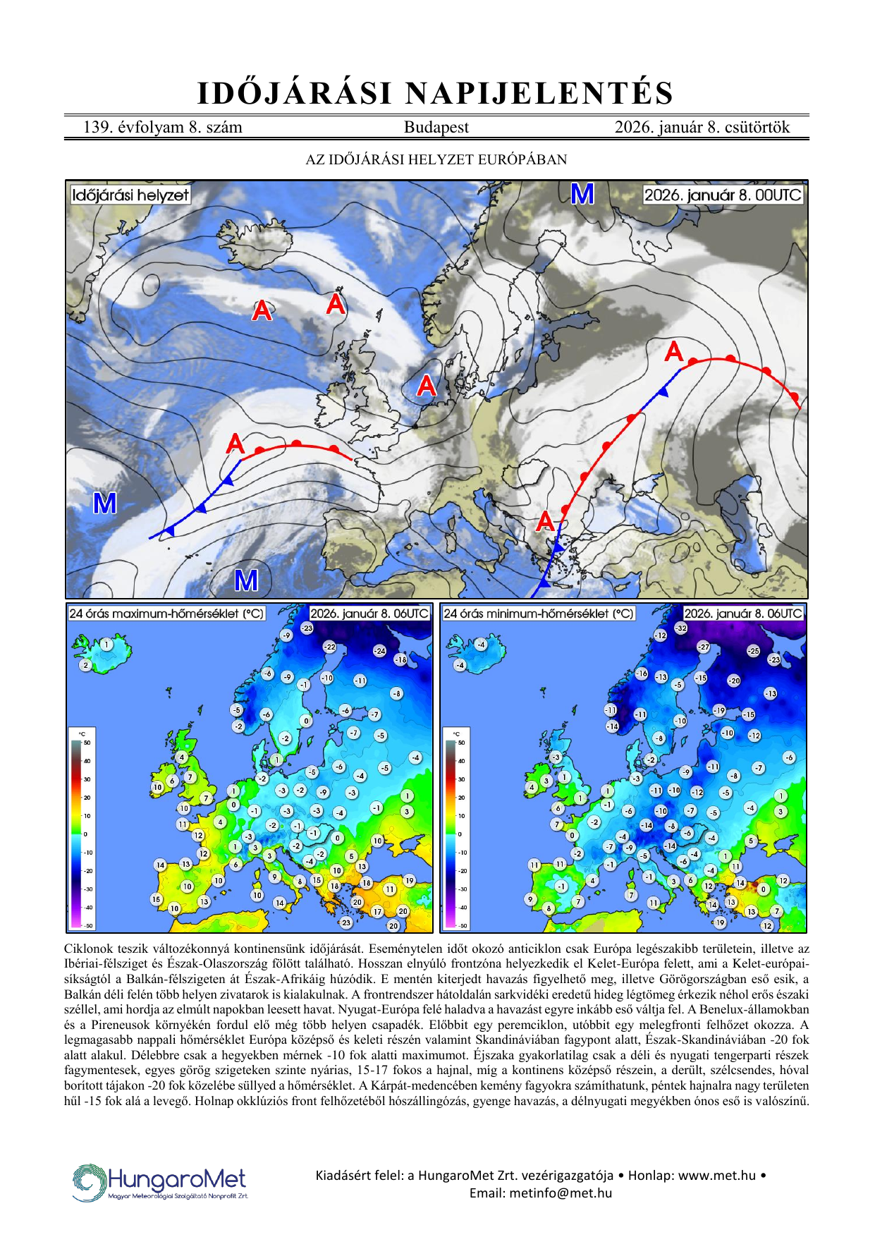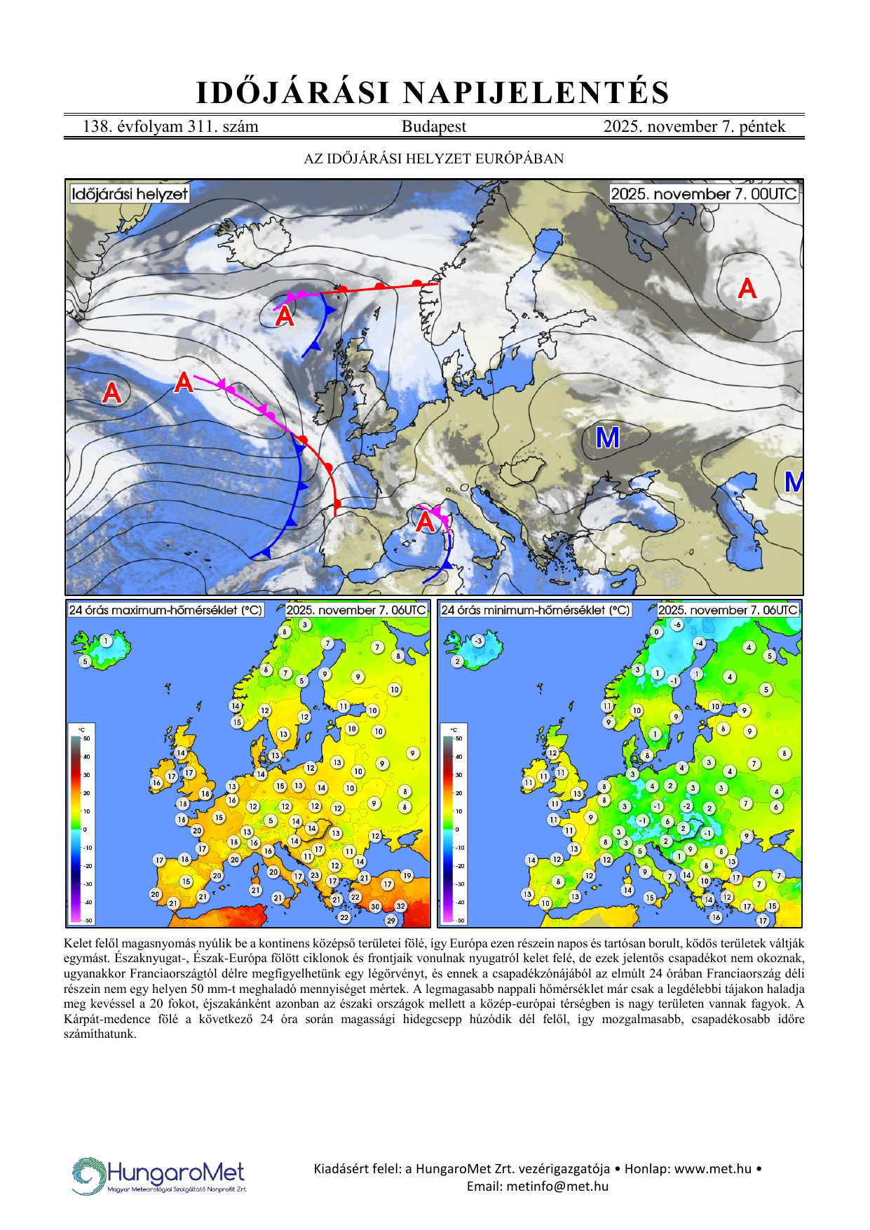Az európai kitekintés a fronttérkép és a rövid szöveges elemzés mellett bővül a hőmérséklet napi minimum- és maximumértékeit ábrázoló térképekkel.