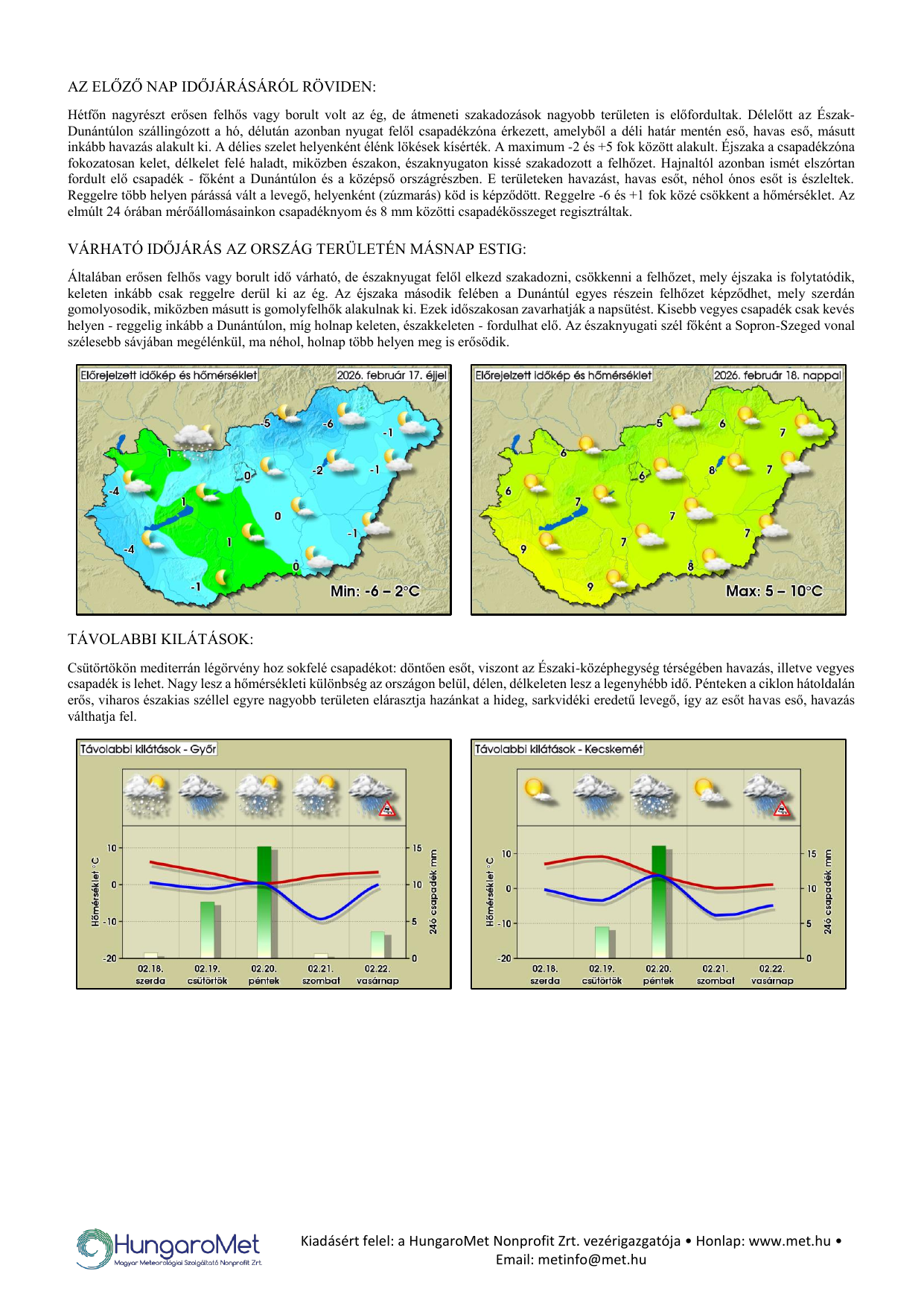 A meteorológiai elemek Hungaromet Zrt. által mért napi értékei ezentúl kontúrtérképeken jelennek meg, de továbbra is tartalmaznak konkrét számértékeket, a korábbinál jóval több állomásról. A térképek alatt táblázatos formában feltüntetjük a napi szélsőértékeket és az abszolút napi rekordadatokat. Az eddigiektől eltérően a napi (24 órás) adatok egységesen, 06 és 06 UTC közötti időszakot fednek le – nagyobb összhangban a nemzetközi gyakorlattal. Az abszolút napi rekordok időszakának tekintetében a hazai évtizedes gyakorlat a következő (rekord napja = aznap):