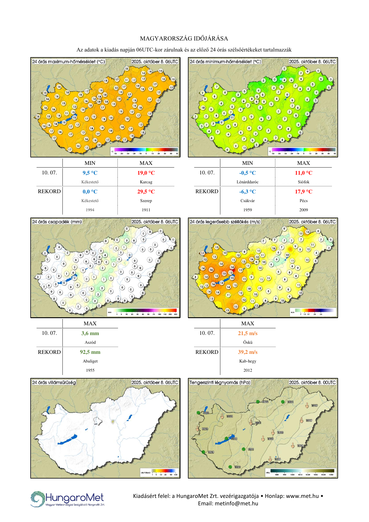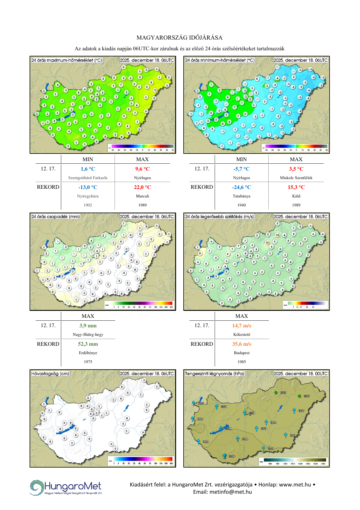 A meteorológiai elemek OMSZ által mért napi értékei ezentúl kontúrtérképeken jelennek meg, de továbbra is tartalmaznak konkrét számértékeket, a korábbinál jóval több állomásról. A térképek alatt táblázatos formában feltüntetjük a napi szélsőértékeket és az abszolút napi rekordadatokat. Az eddigiektől eltérően a napi (24 órás) adatok egységesen, 06 és 06 UTC közötti időszakot fednek le – nagyobb összhangban a nemzetközi gyakorlattal.